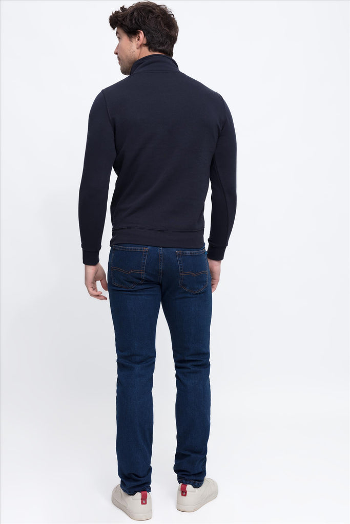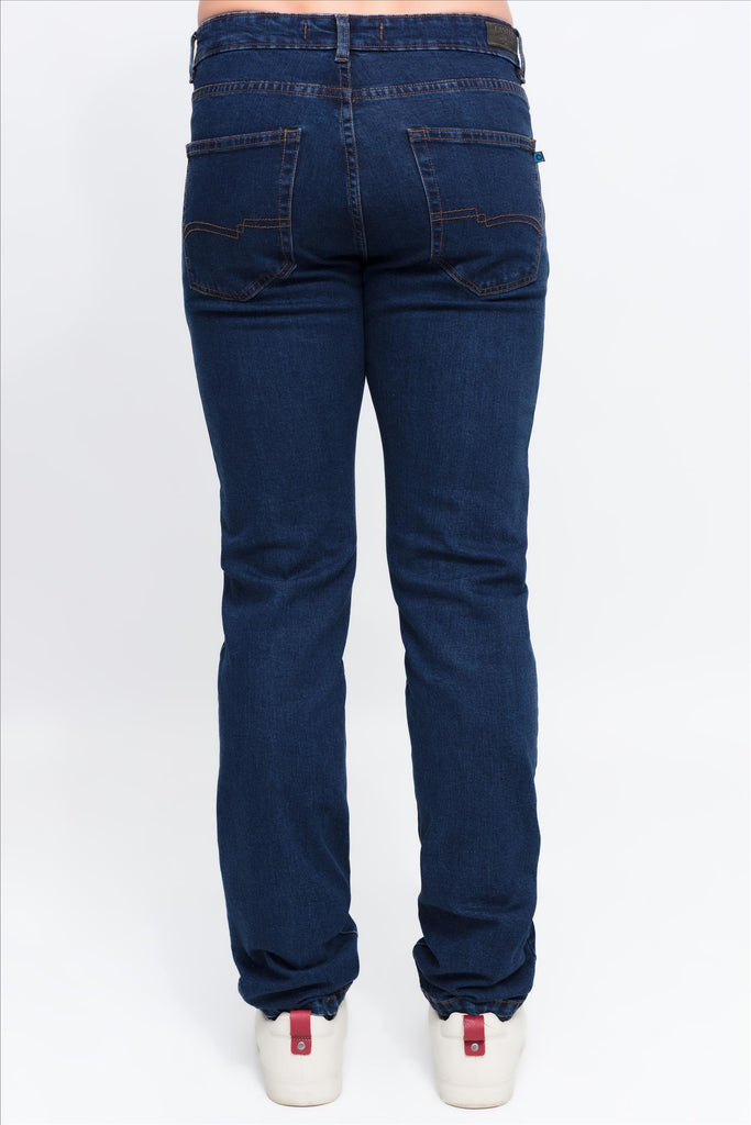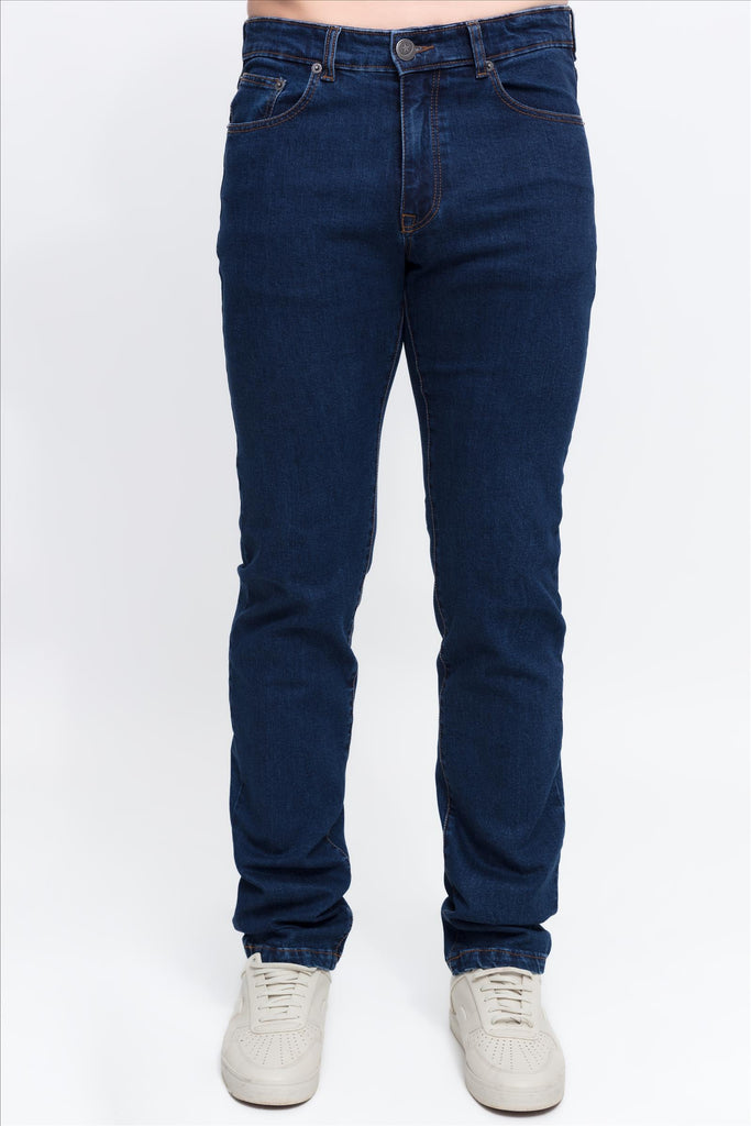 Pantalón vaquero 5 bolsillos. Tejido confort. Tejido con licra. De corte recto. Tiro alto. Caja relajada. Color azul medio.