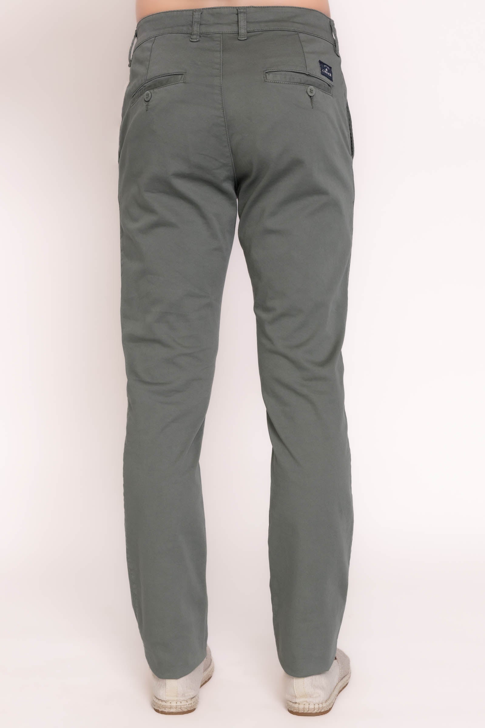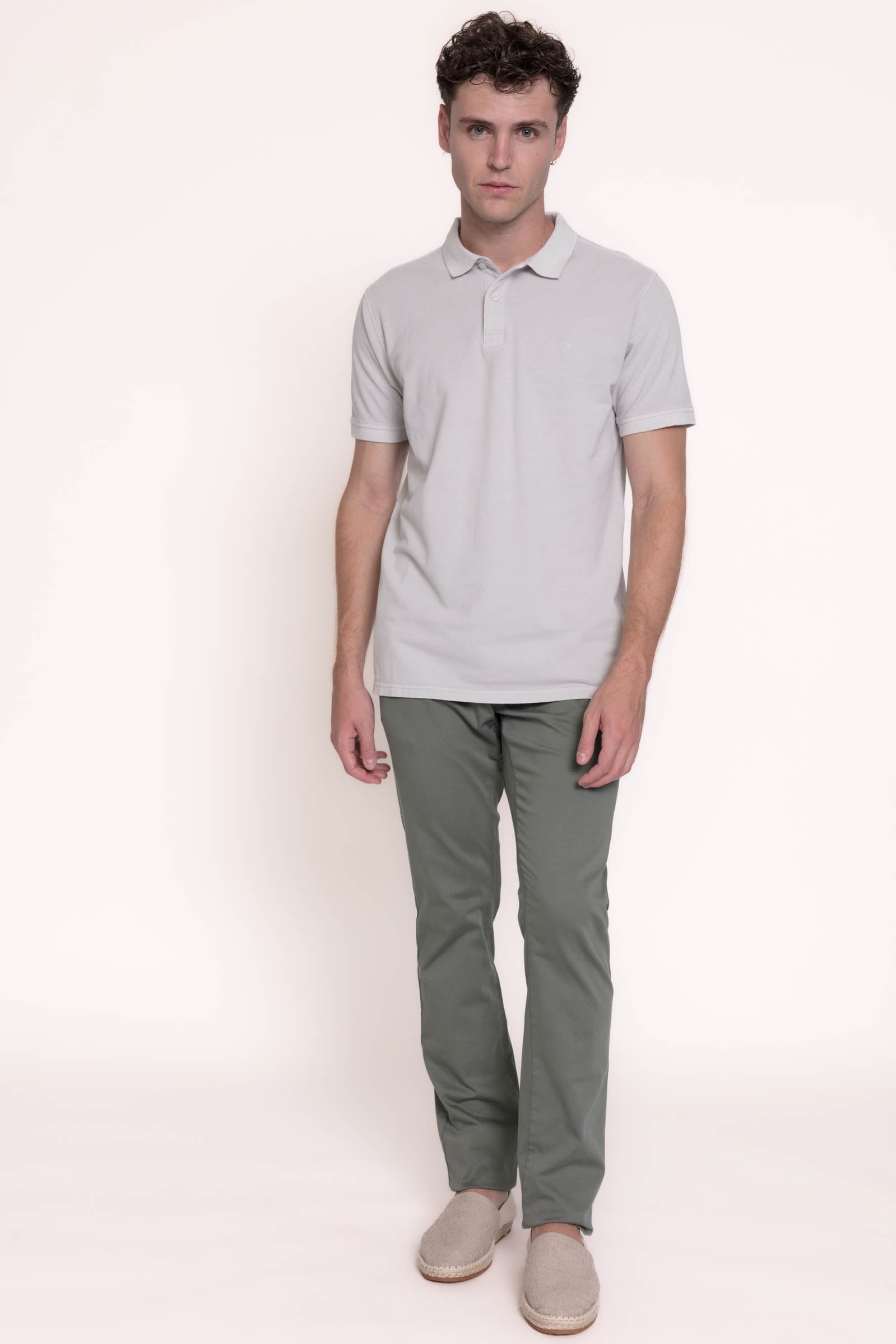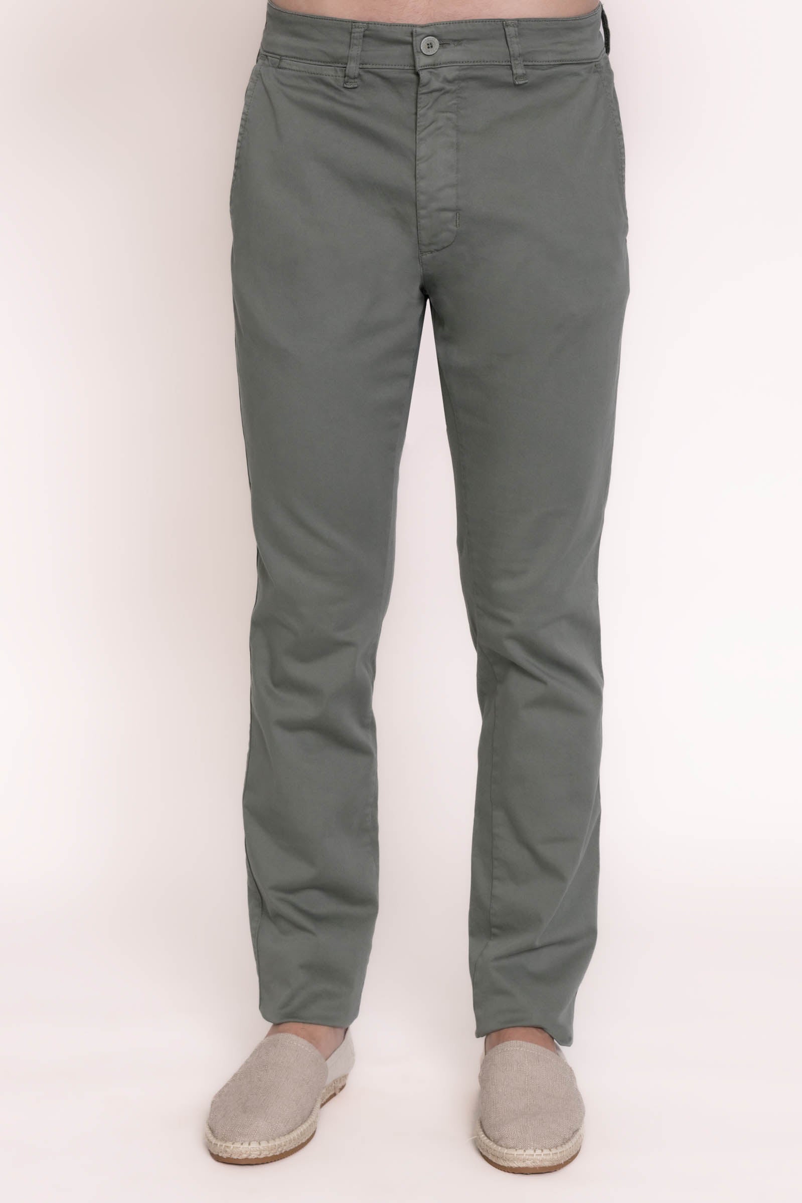 Estilo chinos. Regular fit. Tejido de algodón satén. Trabillas para cinturón. Cierre de cremallera y botón. Bolsillo portamonedas a la altura de la cadera. Dos bolsillos delanteros. Dos bolsillos con botón en la parte posterior.