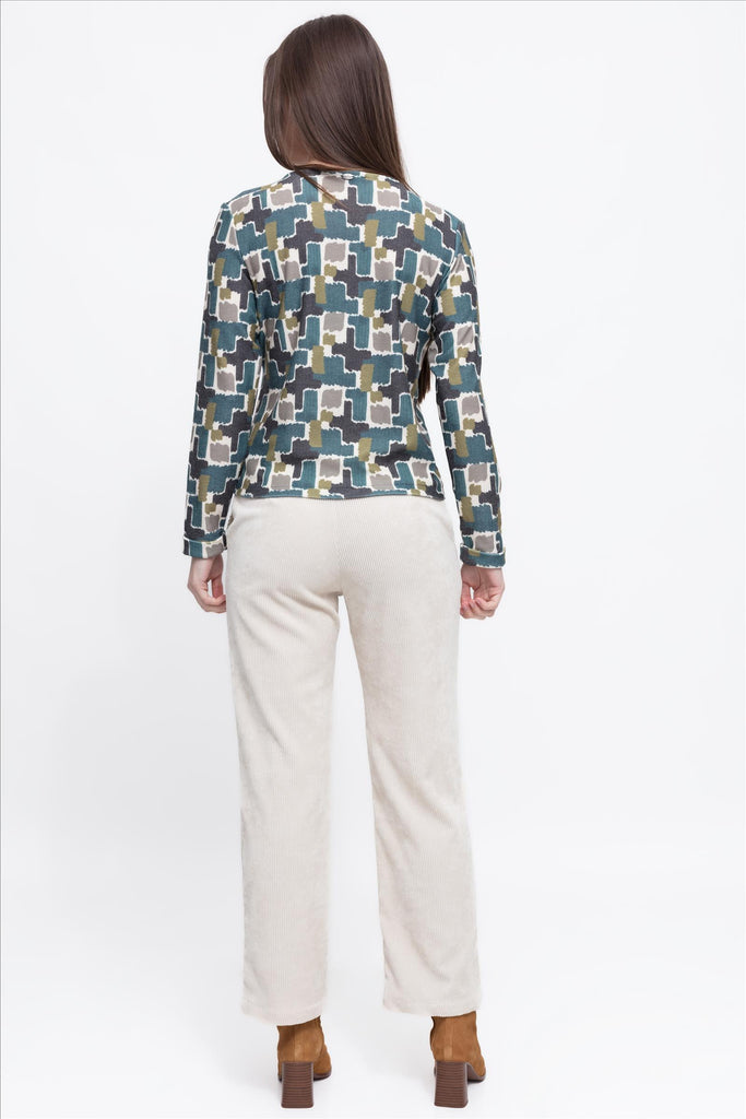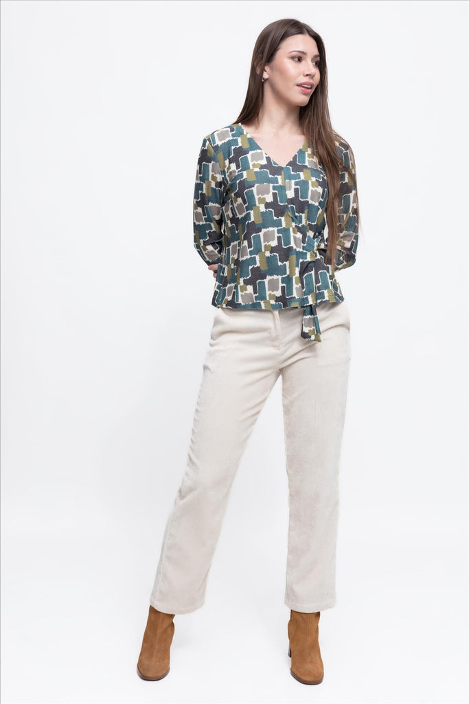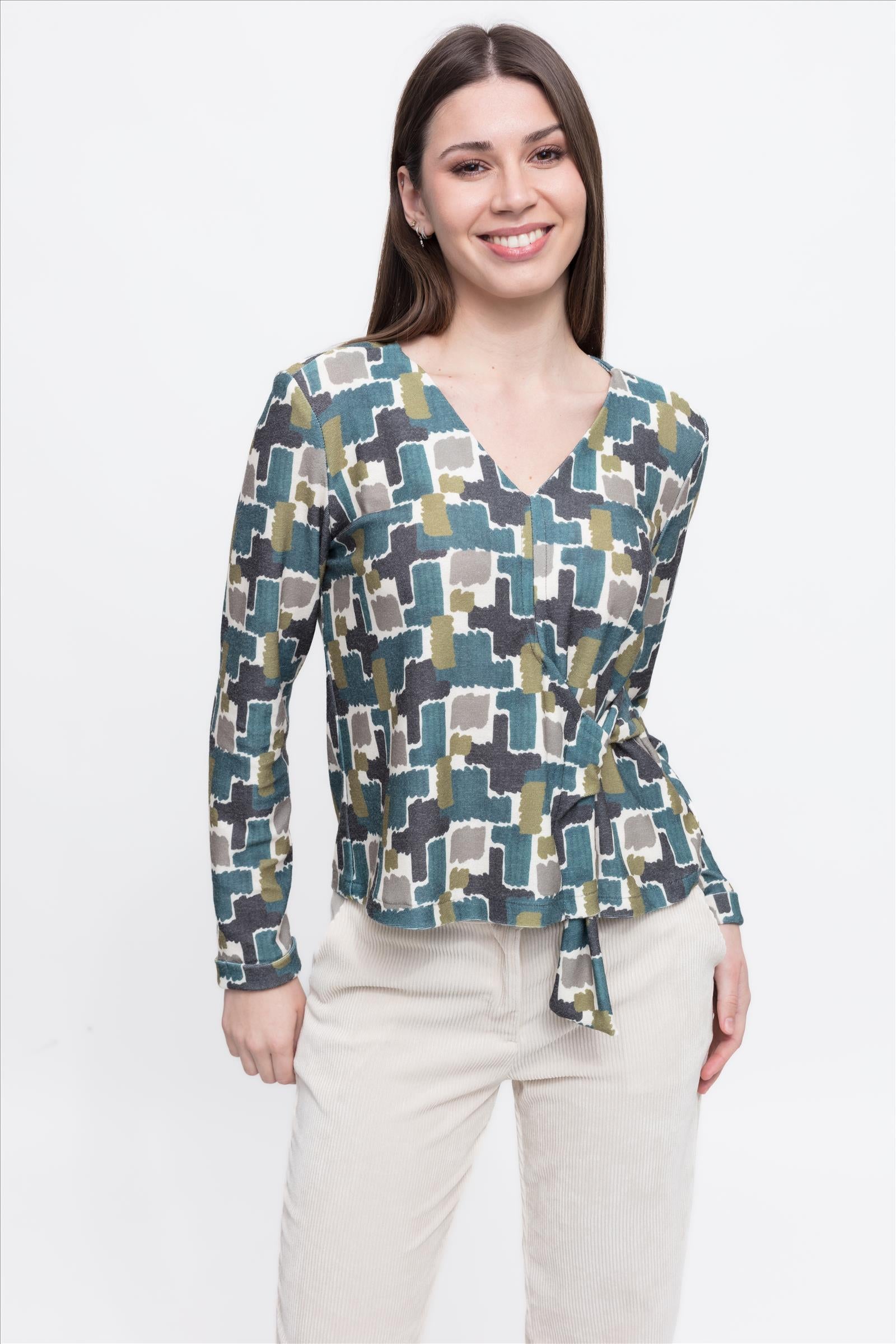 Top de punto estampado. Escote en V. Cuerpo cruzado con detalle fruncido. Manga larga con goma en puños.