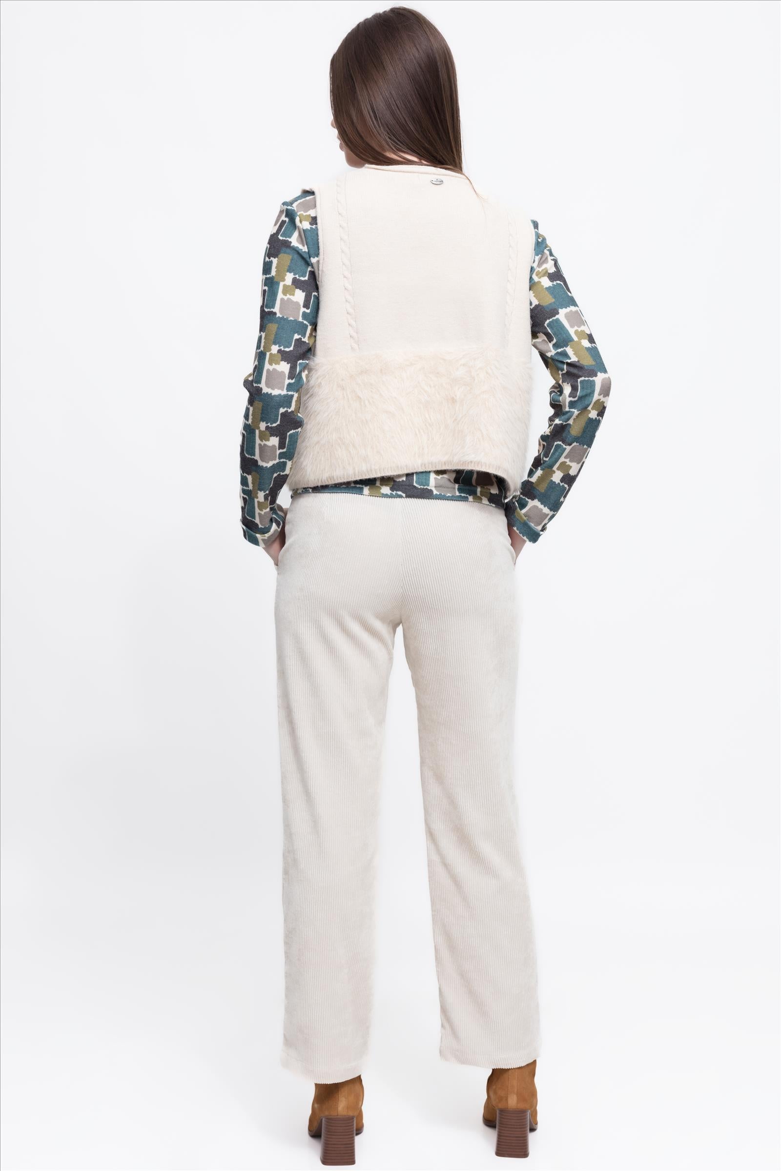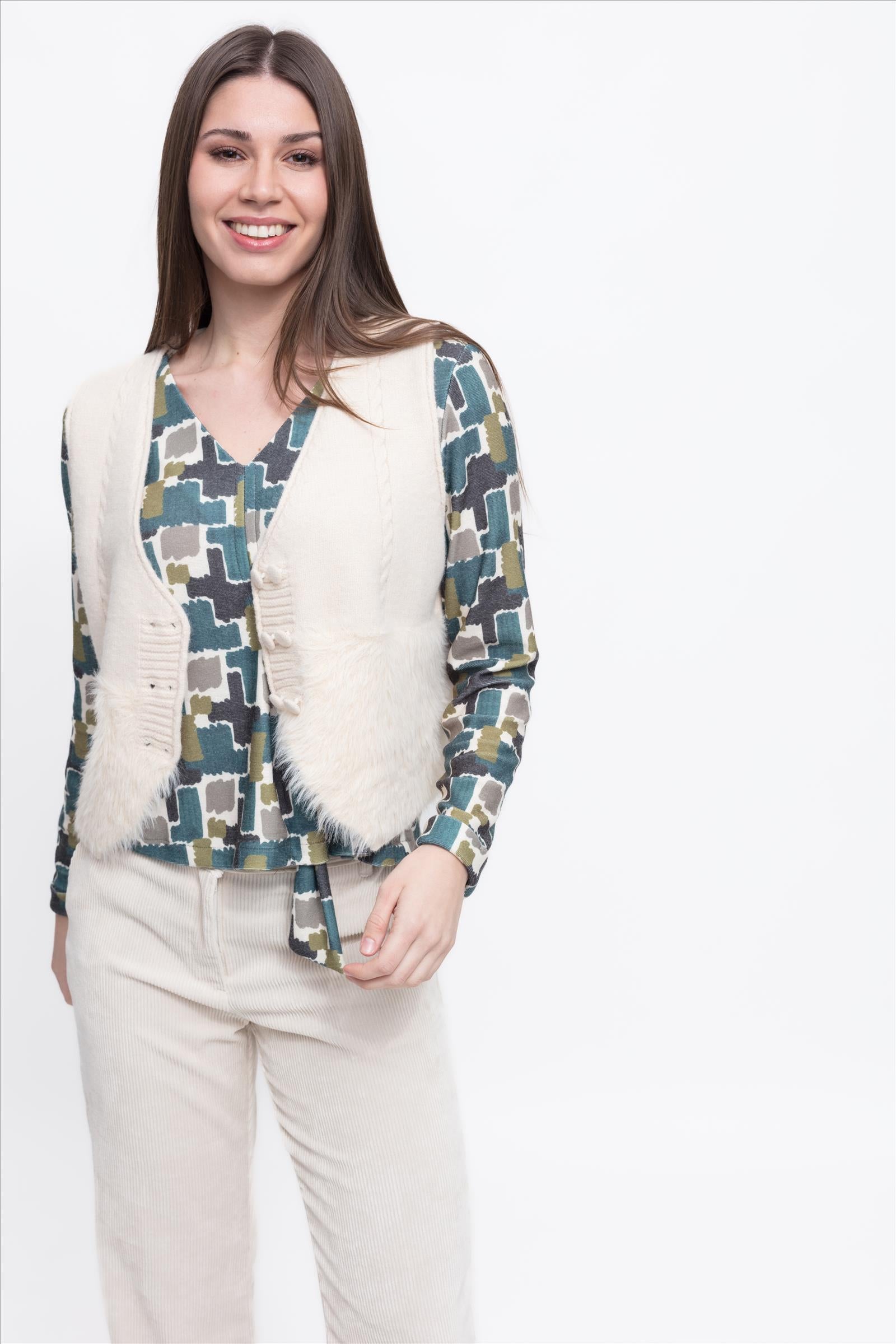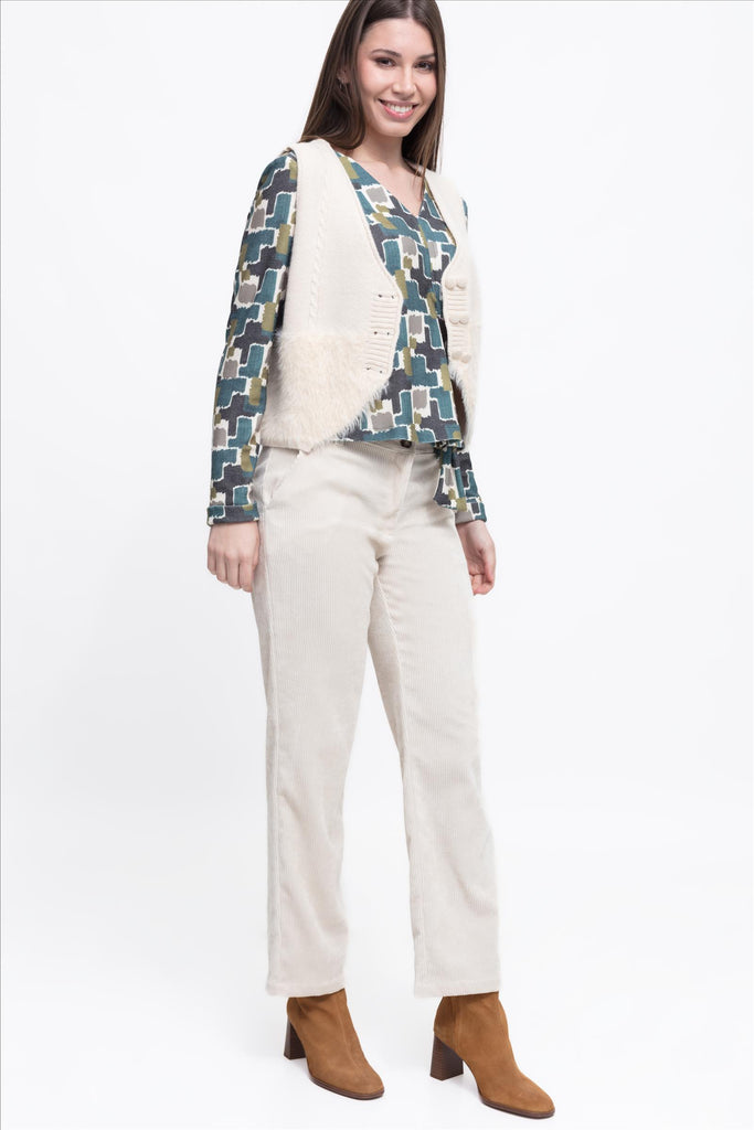 Chaleco corto combinado de punto soft y peluche. Escote cruzado con cuatro botones.