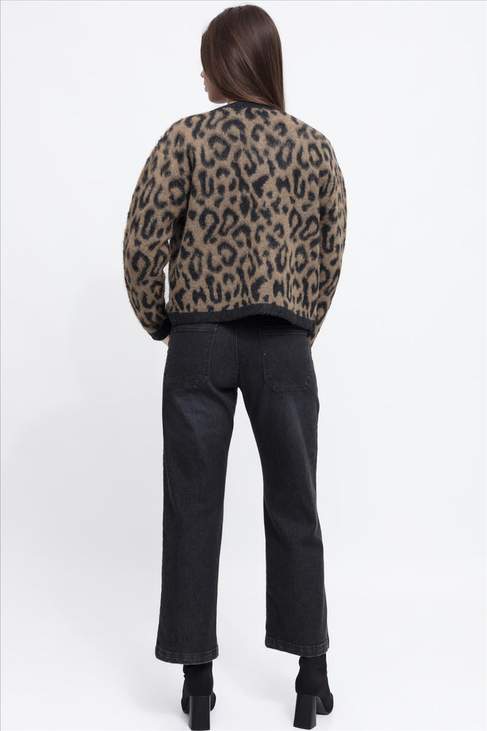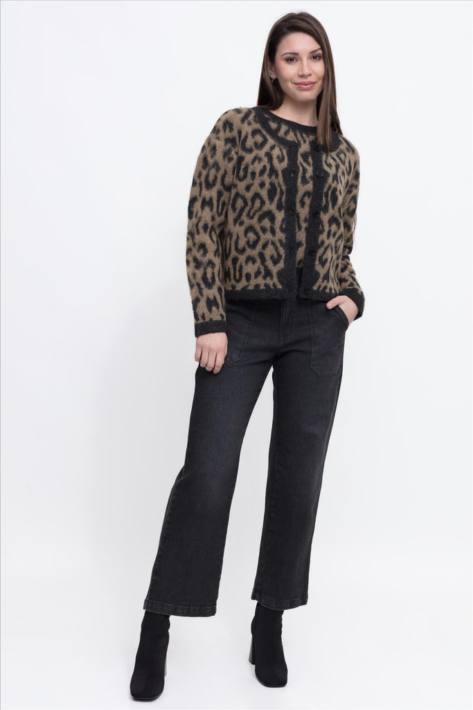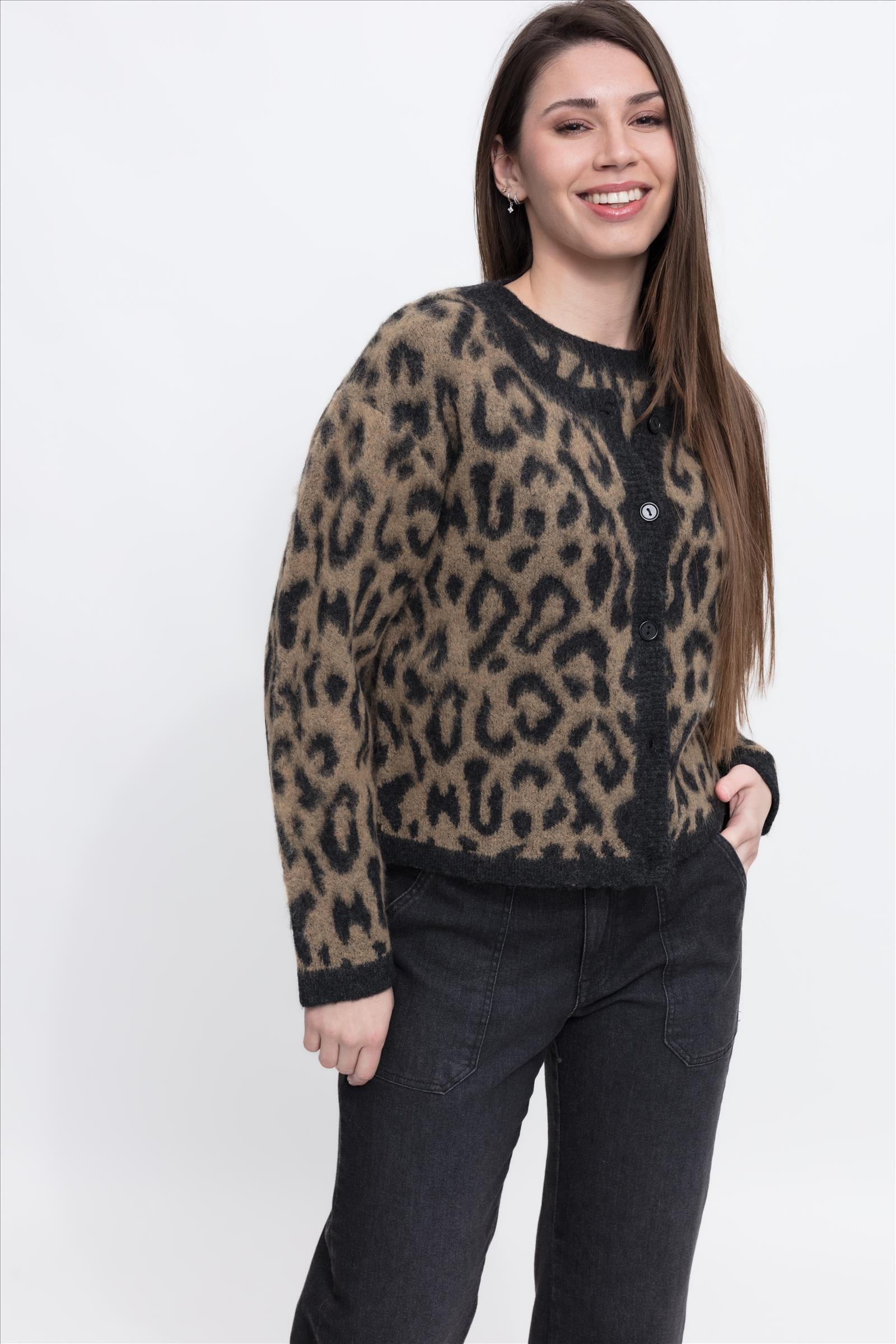 Cárdigan de punto soft de escote redondo animal print en tonos negros y ocres.