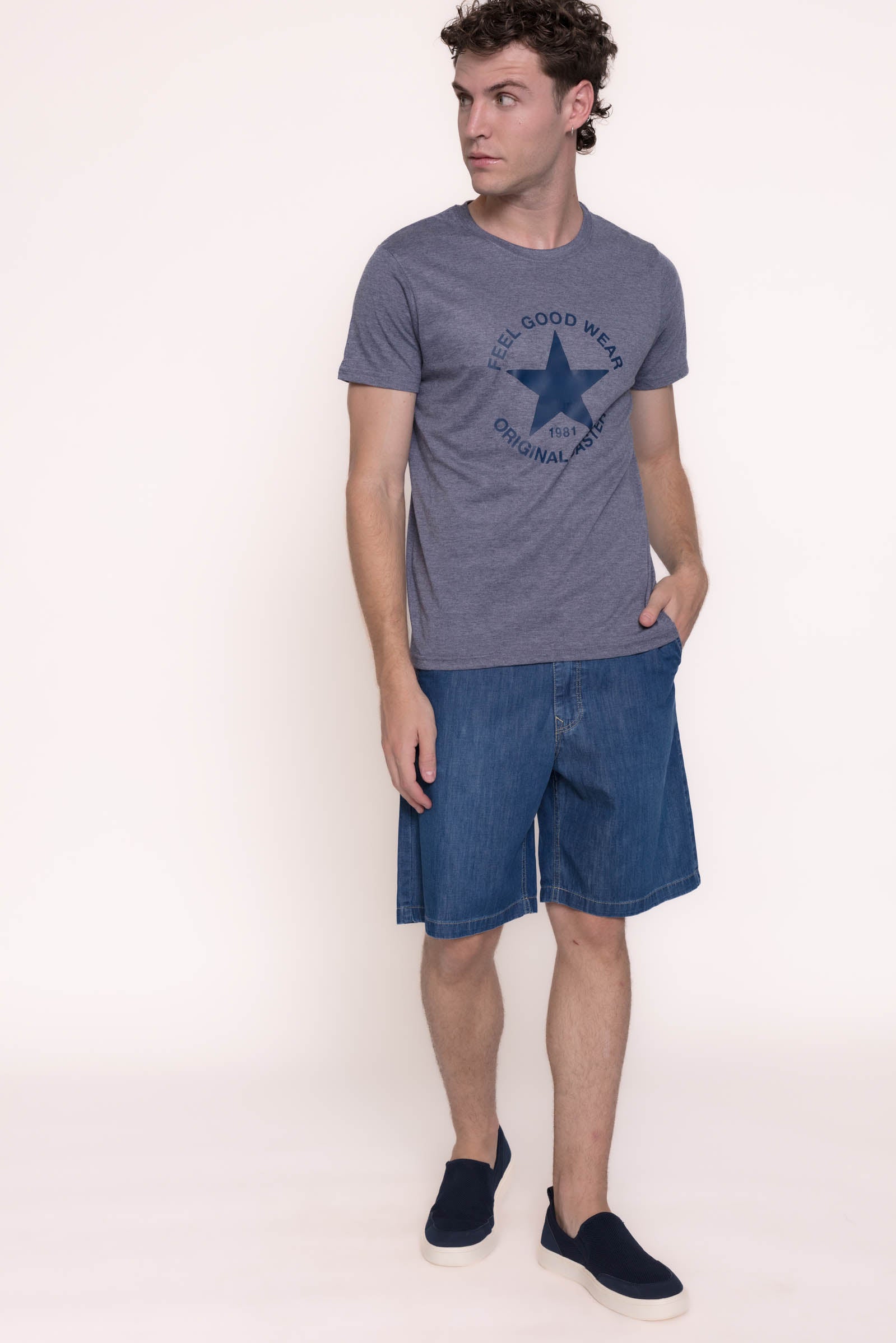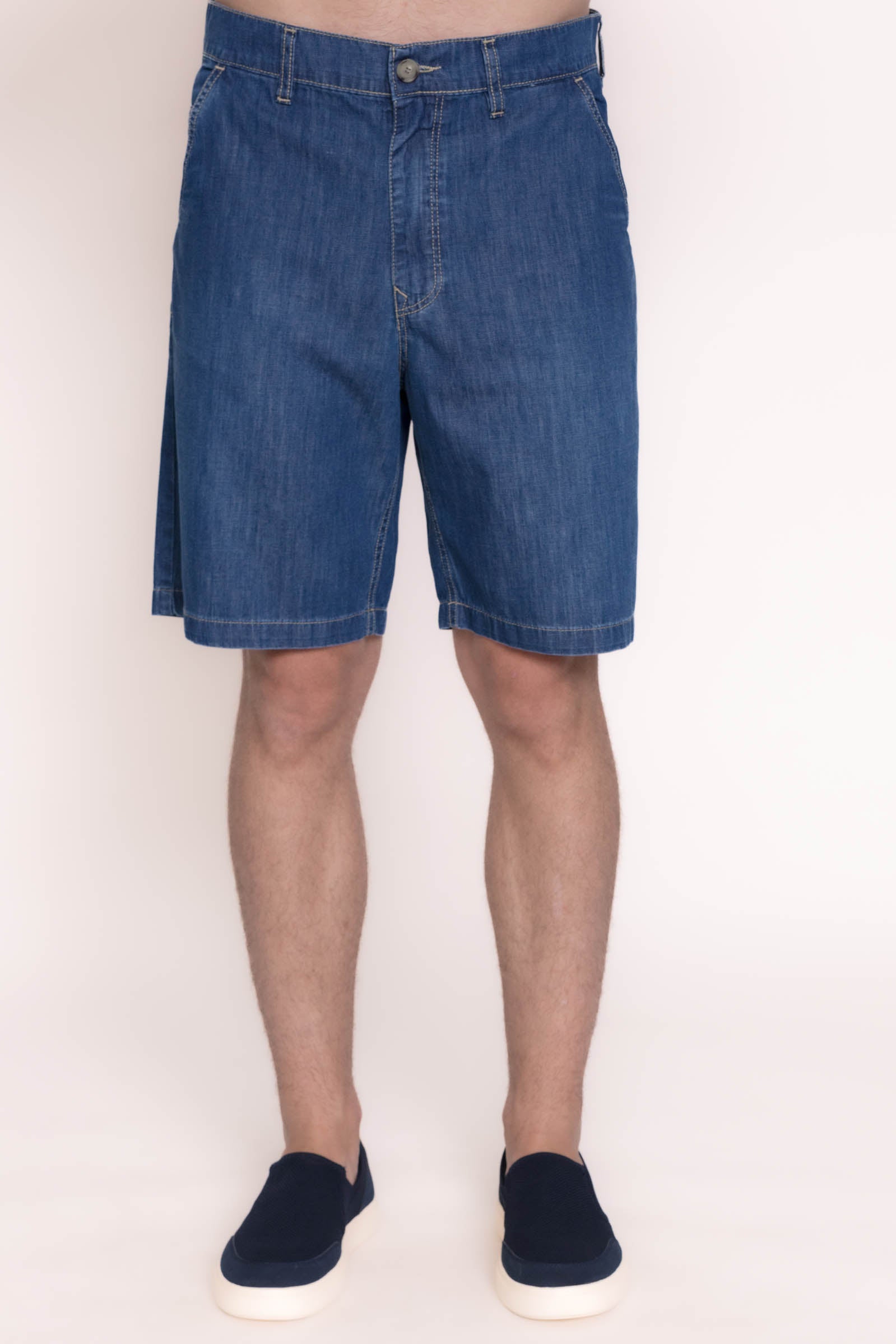 Regular fit. Tejido tejano denim. Lavado azul . Cierre de cremallera y botón. Trabillas para cinturón. Dos bolsillos estilo chino en delantero. Dos bolsillos de parche en la parte posterior.