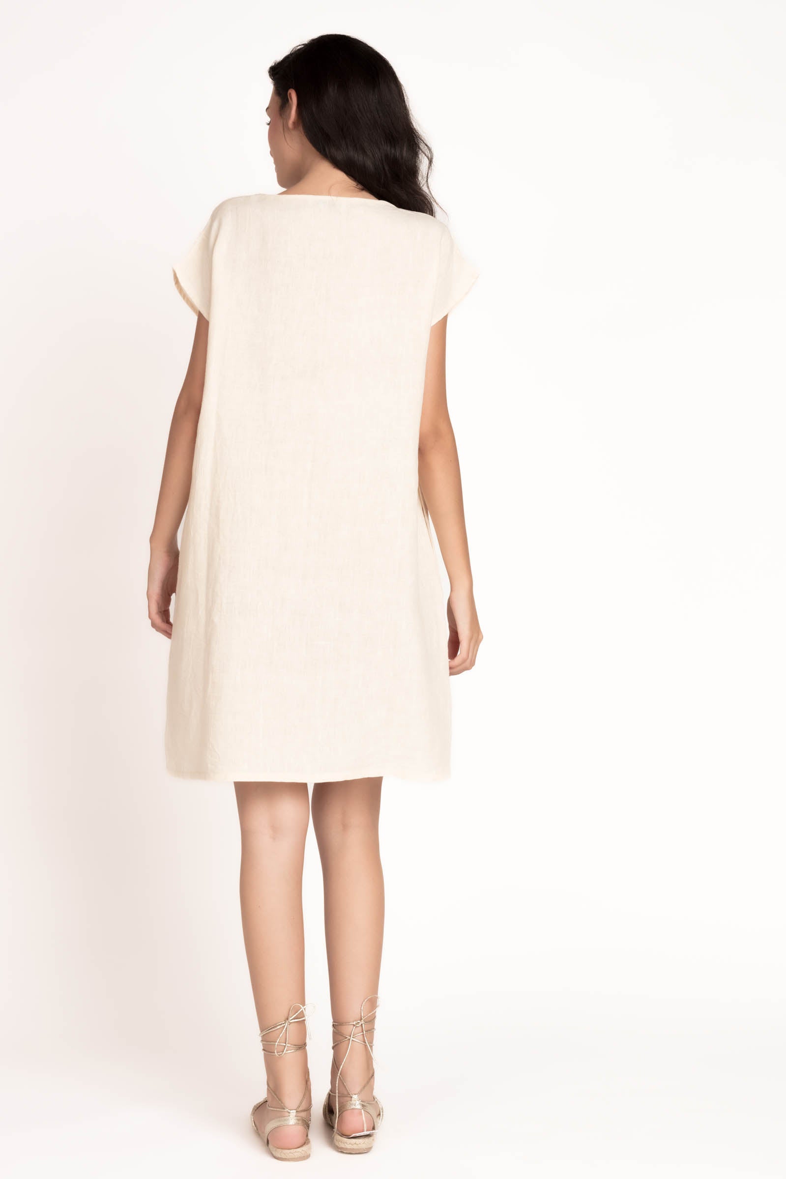 Diseño recto. Corte evasé. Largo por encima de la rodilla. Tejido 100% lino. Tiras bordadas. Escote redondo con abertura. Manga caída.